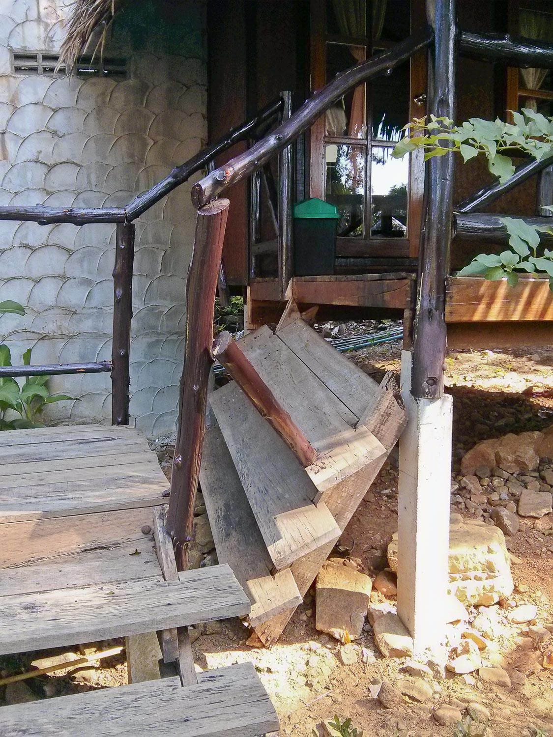 Once on Koh Chang, we had to hire our minibus driver to take us directly to our resort, which meant another outlay on transportation and another 45 minutes of driving. Koh Chang is the second-largest island in Thailand (behind Phuket) and very, very developed, especially on the western coast. As we drove in the dark, I was amazed at the amount of businesses and lights that whizzed by before we finally reached our bungalows. After checking in, getting situated, and thinking the day was just about over, the staircase to Michael’s bungalow buckled and collapsed as he and Becca were standing on it. Luckily no one was hurt (too badly).