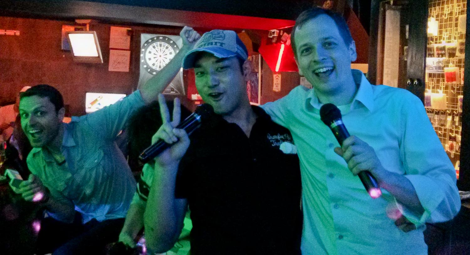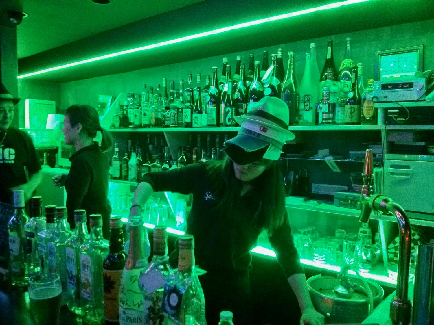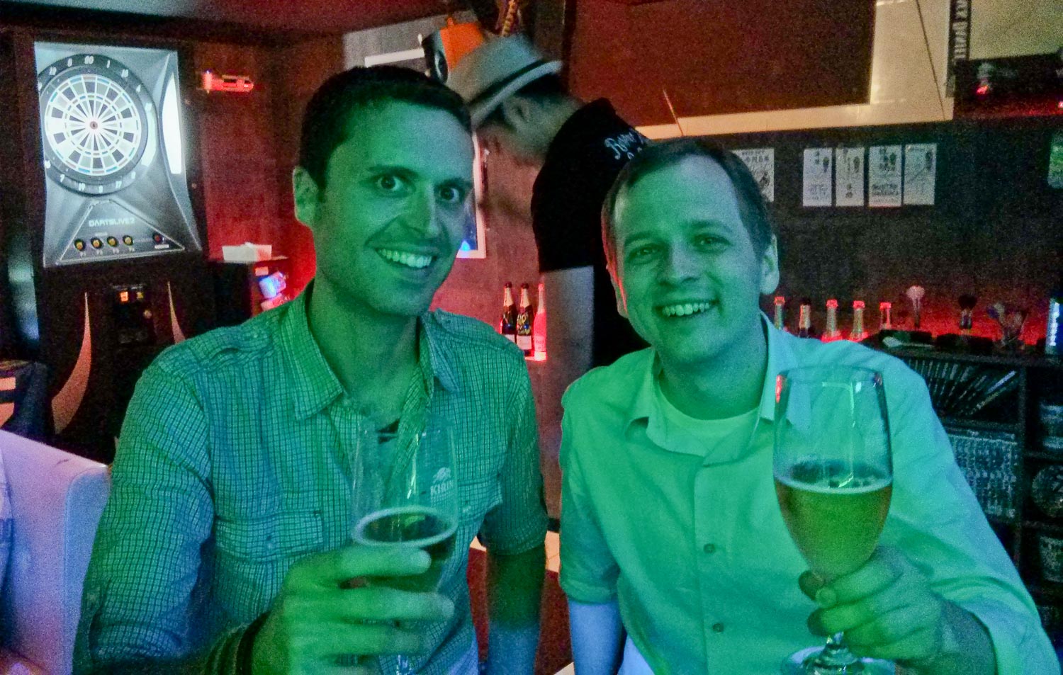 Such an approach led us to a cozy, fifth-floor bar with green lighting, karaoke, darts, and about half a dozen customers. The bar staff treated us with slightly incredulous friendliness, noticeably confused/impressed that a couple white boys had found their way into this random local watering hole.