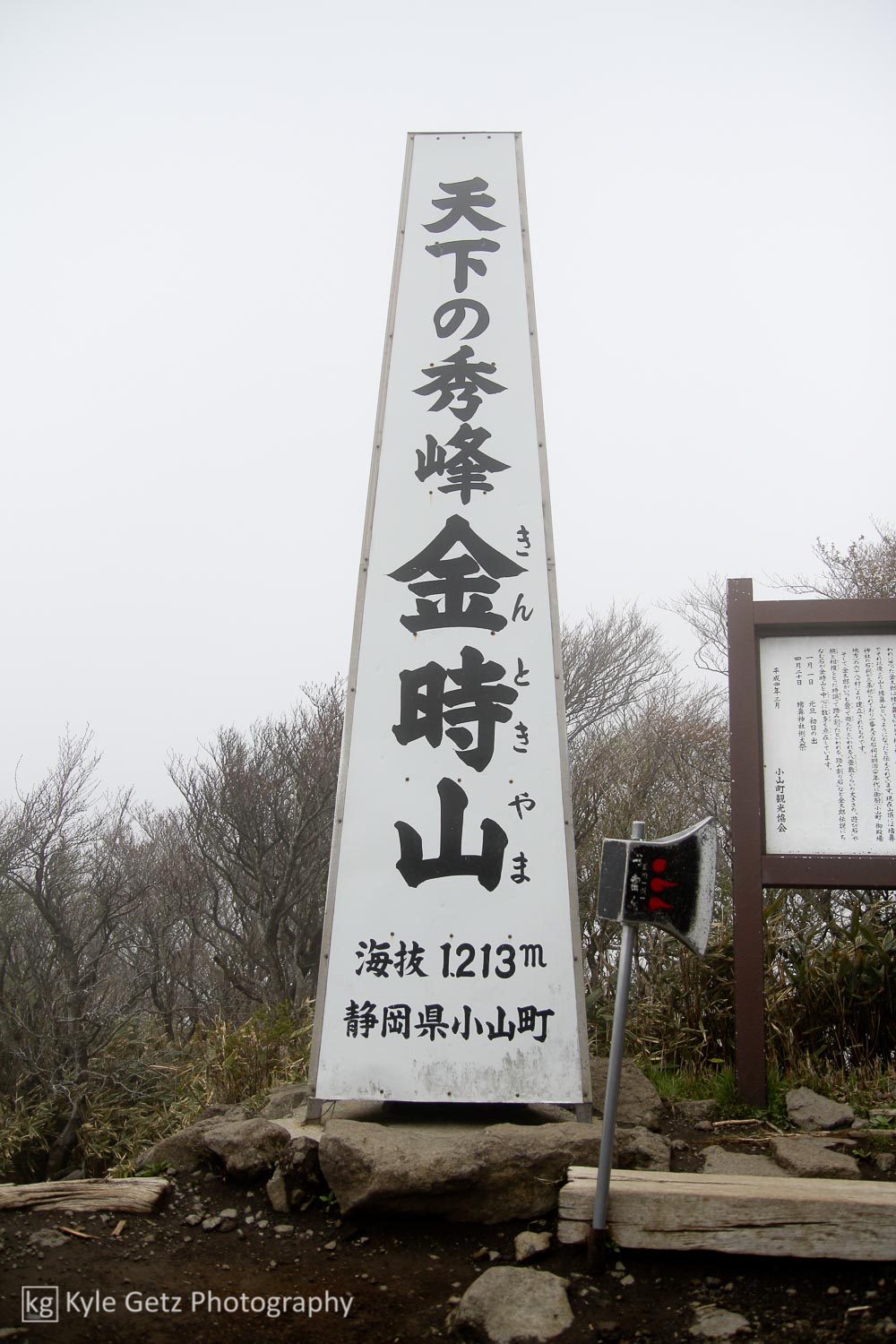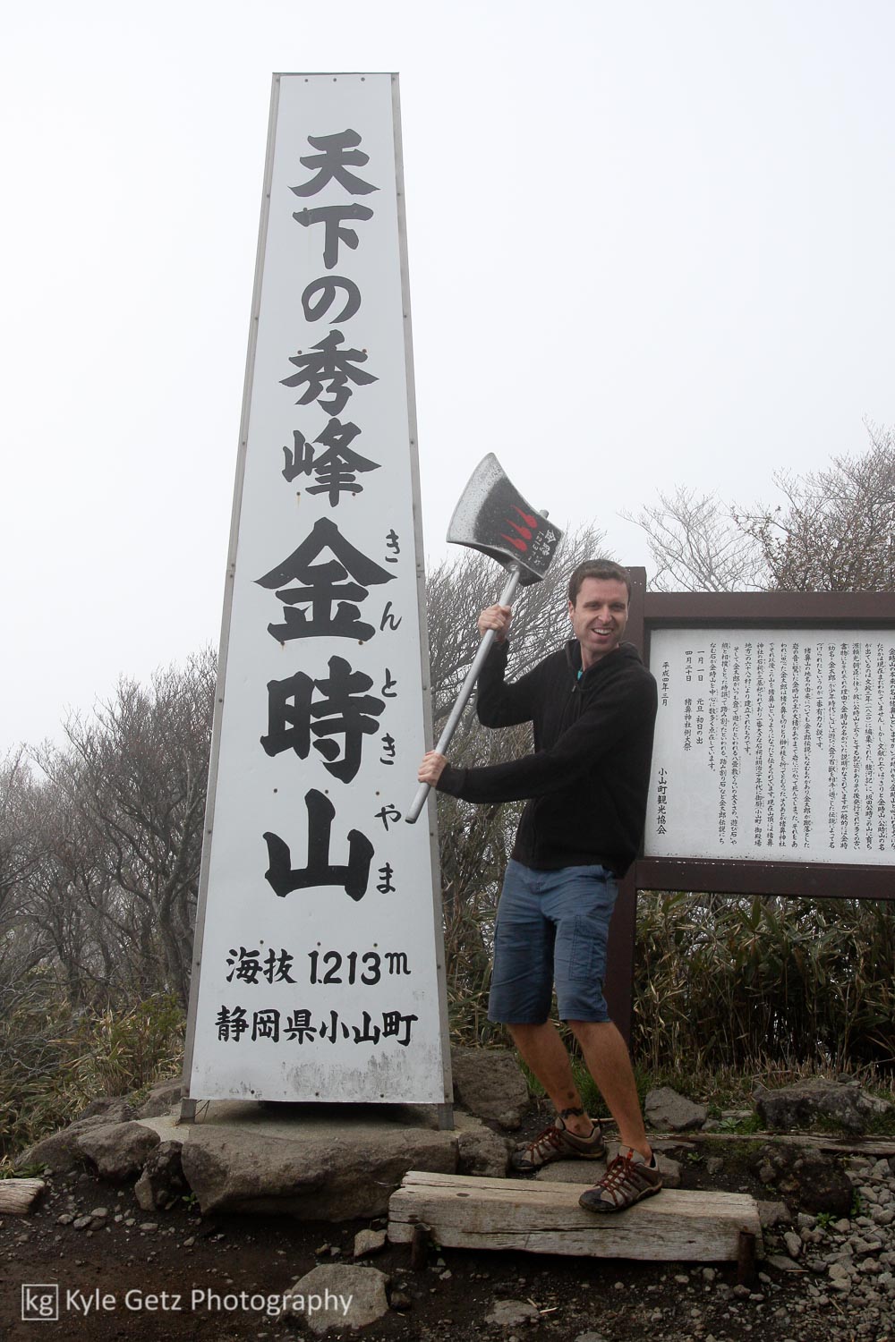 The next day’s weather was much nicer, so we set out to hike up Mt. Kintoki, one of the peaks of the Hakone caldera and, more importantly, the closest trek to our ryokan. It was moderately difficult and all uphill, but luckily the weather was cool and cloudy. We saw a few friendly Japanese folks on the trail and about an hour and a half after we started, we arrived at the foggy, wet, cold summit. On a clear day, Mt. Fuji is clearly visible, but we had to settle for fleeting glimpses in between the dense clouds as we sipped hot chocolate and coffee in the small cabin at the top. I was annoyed that I had hauled my camera all that way only to be thwarted by a whiteout, so we made sure to take some photos with the summit’s elevation marker. And an axe, because, hey, why not, right?