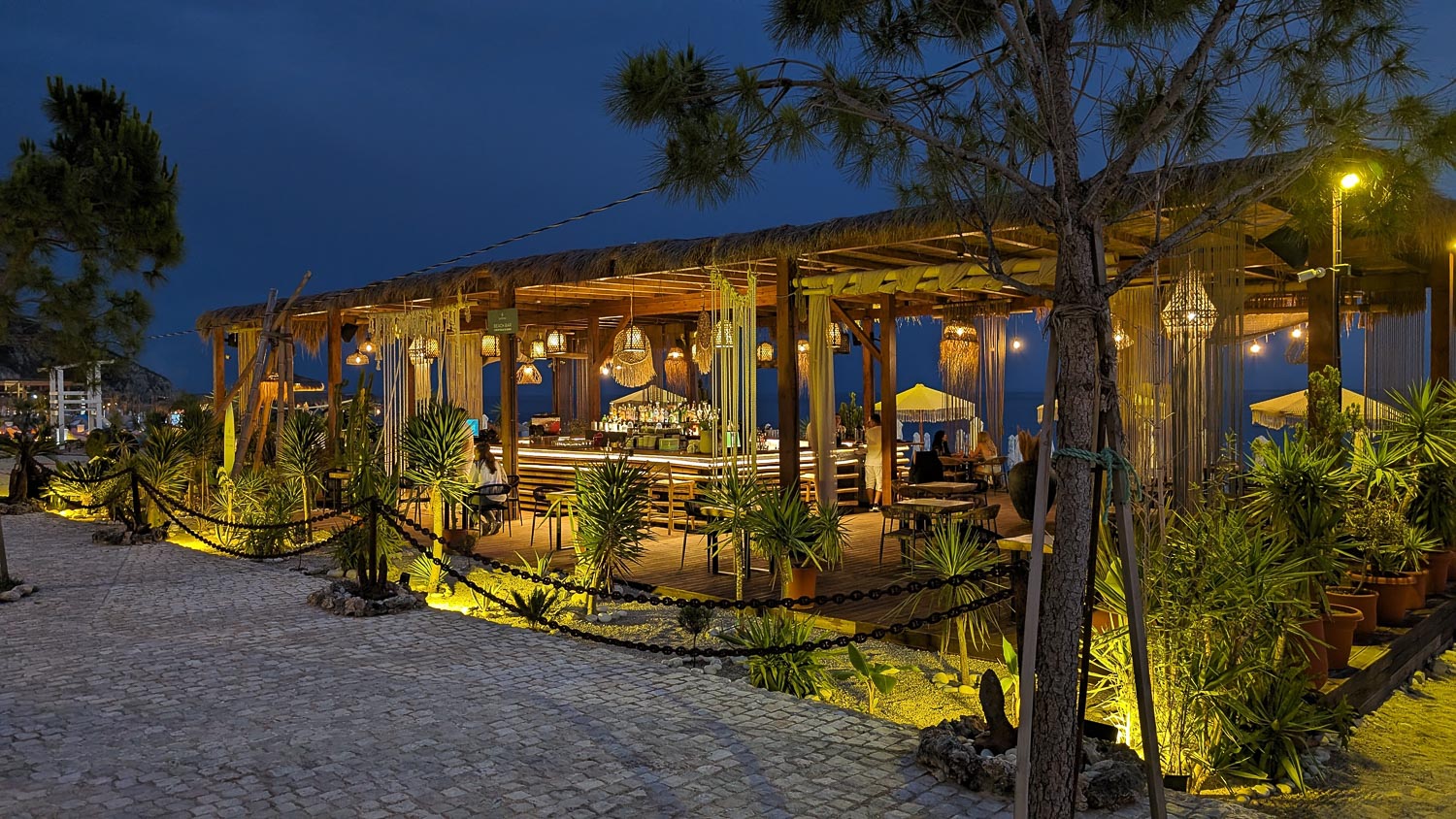 Thursday: Another Explorations, another ride on a slow ferry that we didn’t book. A few weeks before the trip, we got an email from the festival organizers saying that one of the ferry company’s boats had broken down recently, so a whole bunch of people (including us) were getting bumped to a slow ferry. We were refunded the difference in price, but it was a little deflating that we’d be stuck on slow boats. Again. Thankfully the weather cooperated – cloudy and even a brief rainstorm – so that we weren’t baking and sweating all afternoon. Somehow we got through passport control quickly and got on the first bus to Dhermi, though there was a lot of extra walking this year: a long walk just to get to the bus (due to road construction) and then a 20-minute death march over cobblestones to get to our hotel. This year we stayed at Nassau Hotel, which was in a different part of town than we’ve seen in years past: the beach southeast of the festival site, which has been built up in recent years to handle all the increased tourism. The aforementioned cobblestone path – which is much cuter when you’re not dragging 50-pound suitcases behind you – is lined with hotels, restaurants, bars, bodegas, beach chairs and umbrellas, and outdoor lounges with hookahs and bean bag chairs.